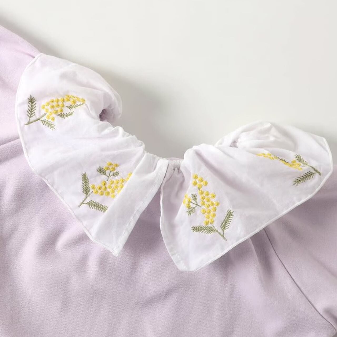 ミモザの刺繍が施されたレースの襟のラッフルカラートップス。
