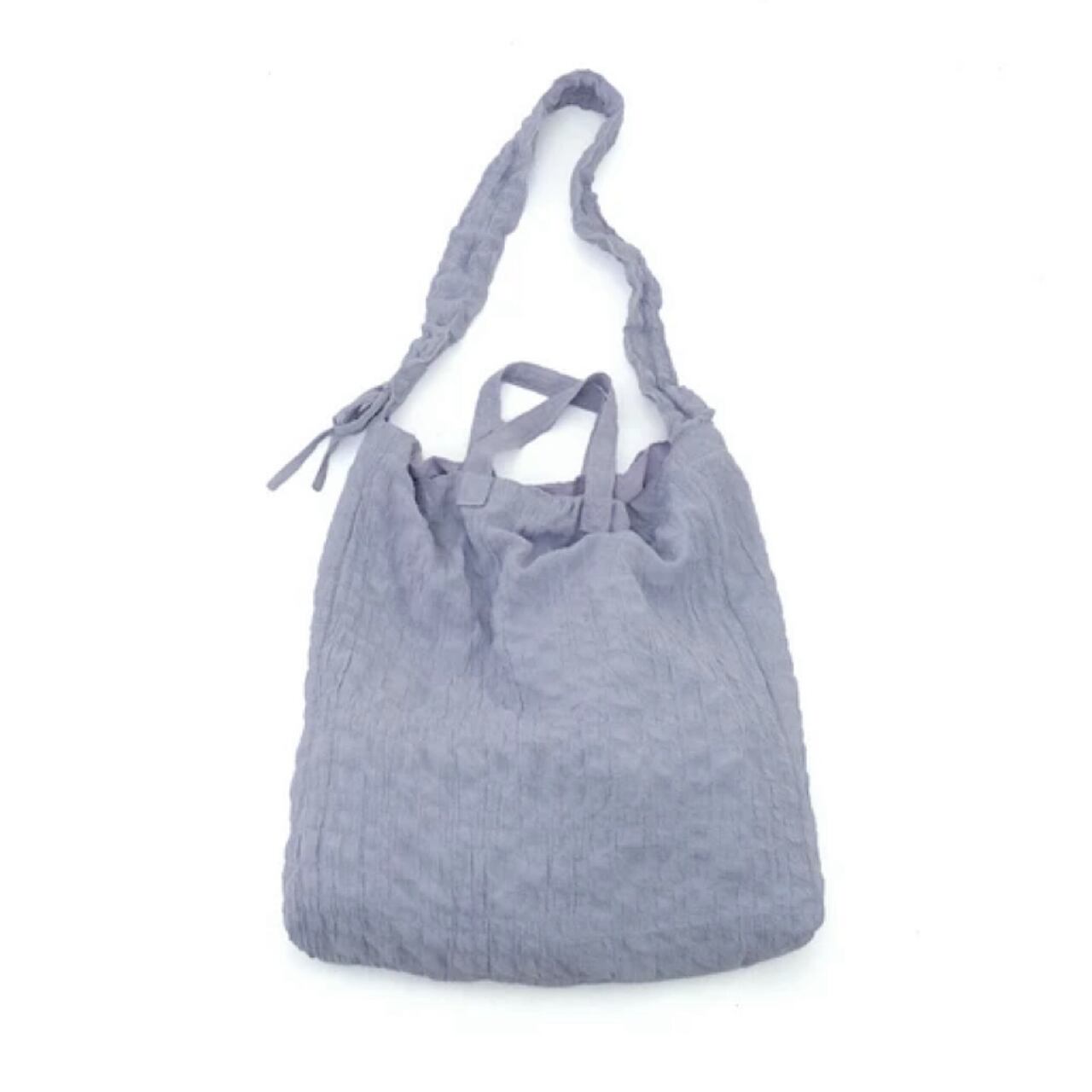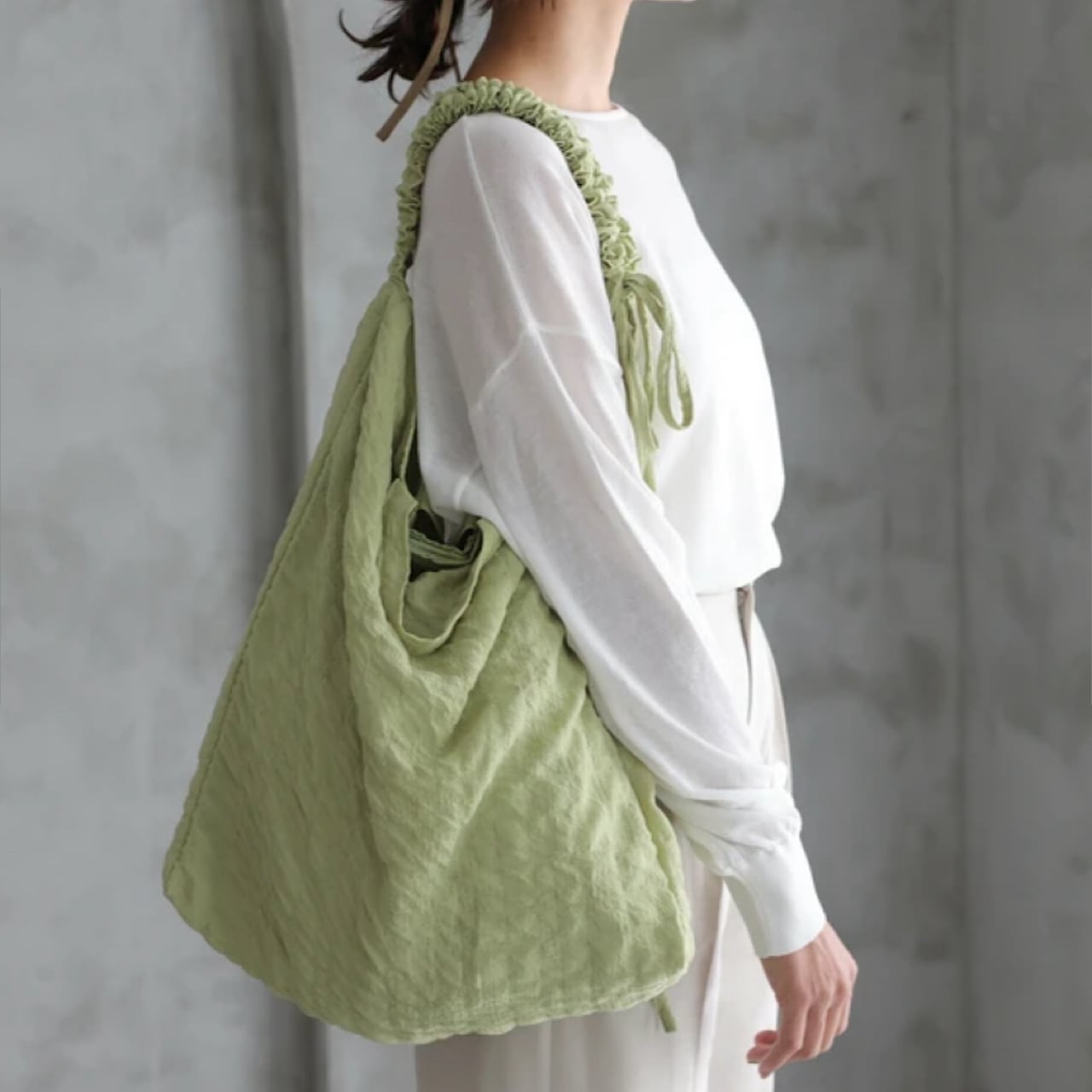 ショルダー部分のギャザーを寄せてお好みの長さに調整できるバッグ。