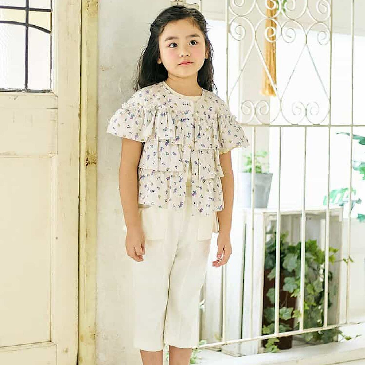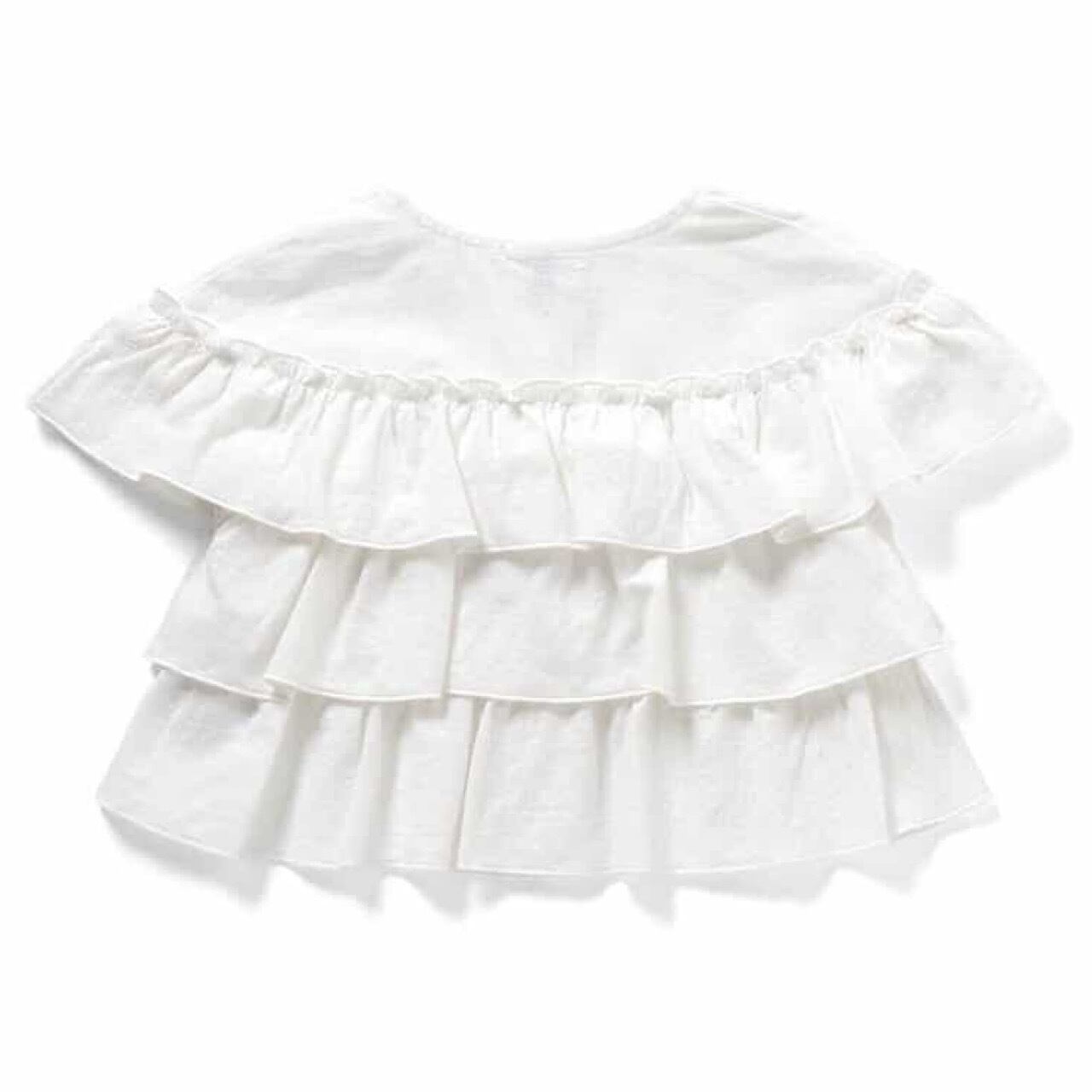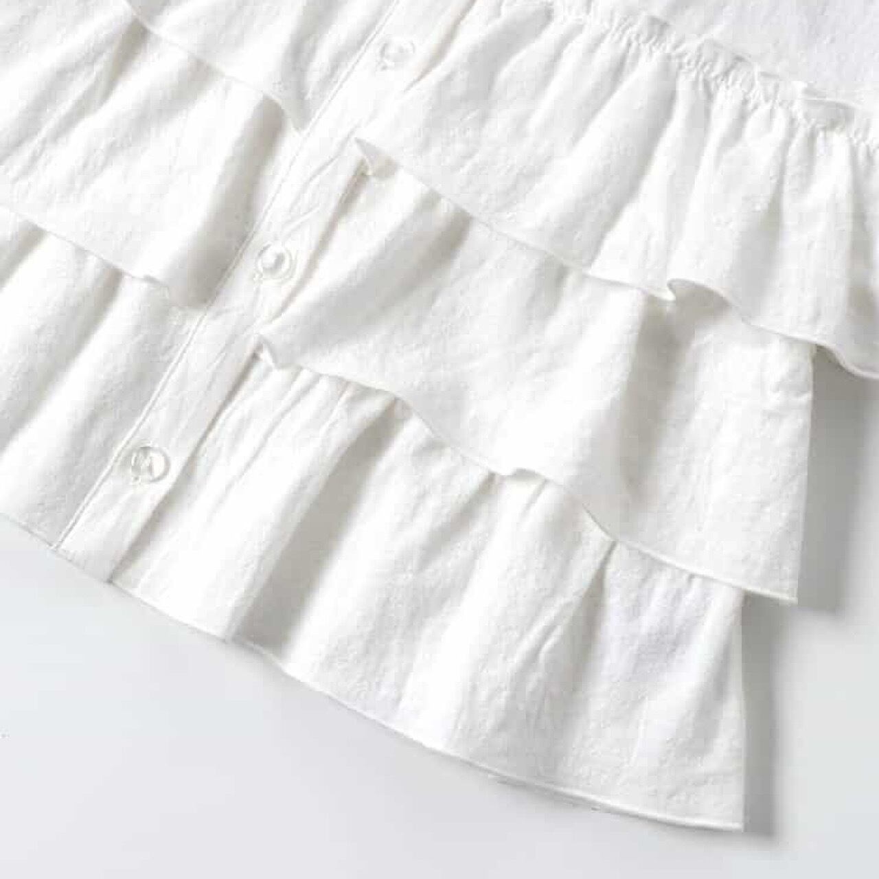 前開きボタンになっていて二段フリルになったシンプルで女の子らしいデザインのブラウス。