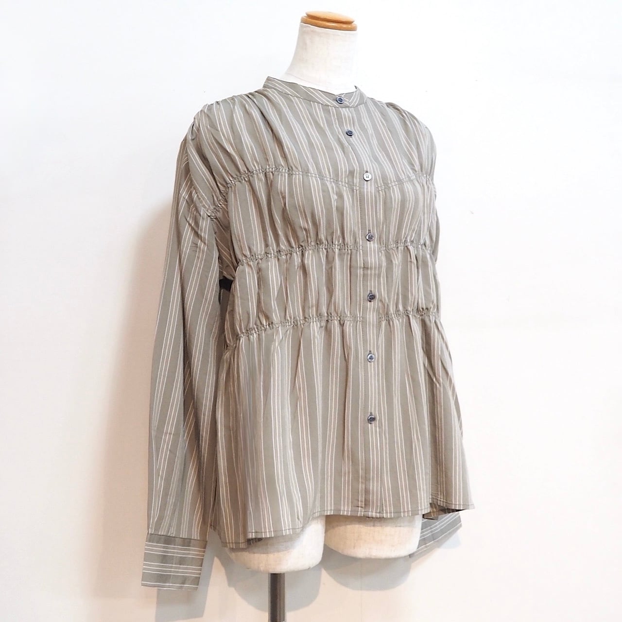 ビスチェを着ているようなデザインのシャーリングシャツ。