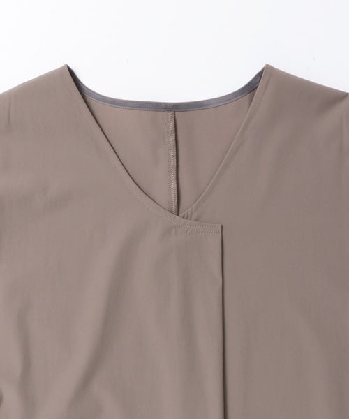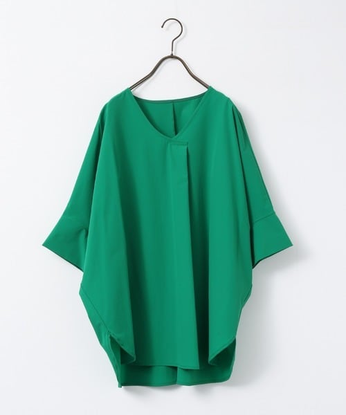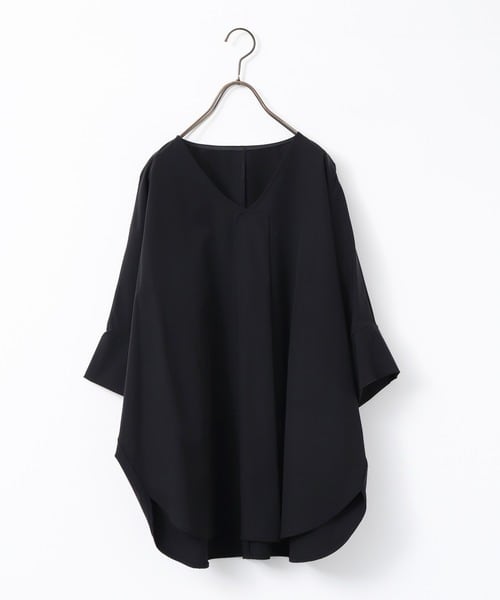ヒップや、肘を隠せる丈感でVネックのドルマントップス。