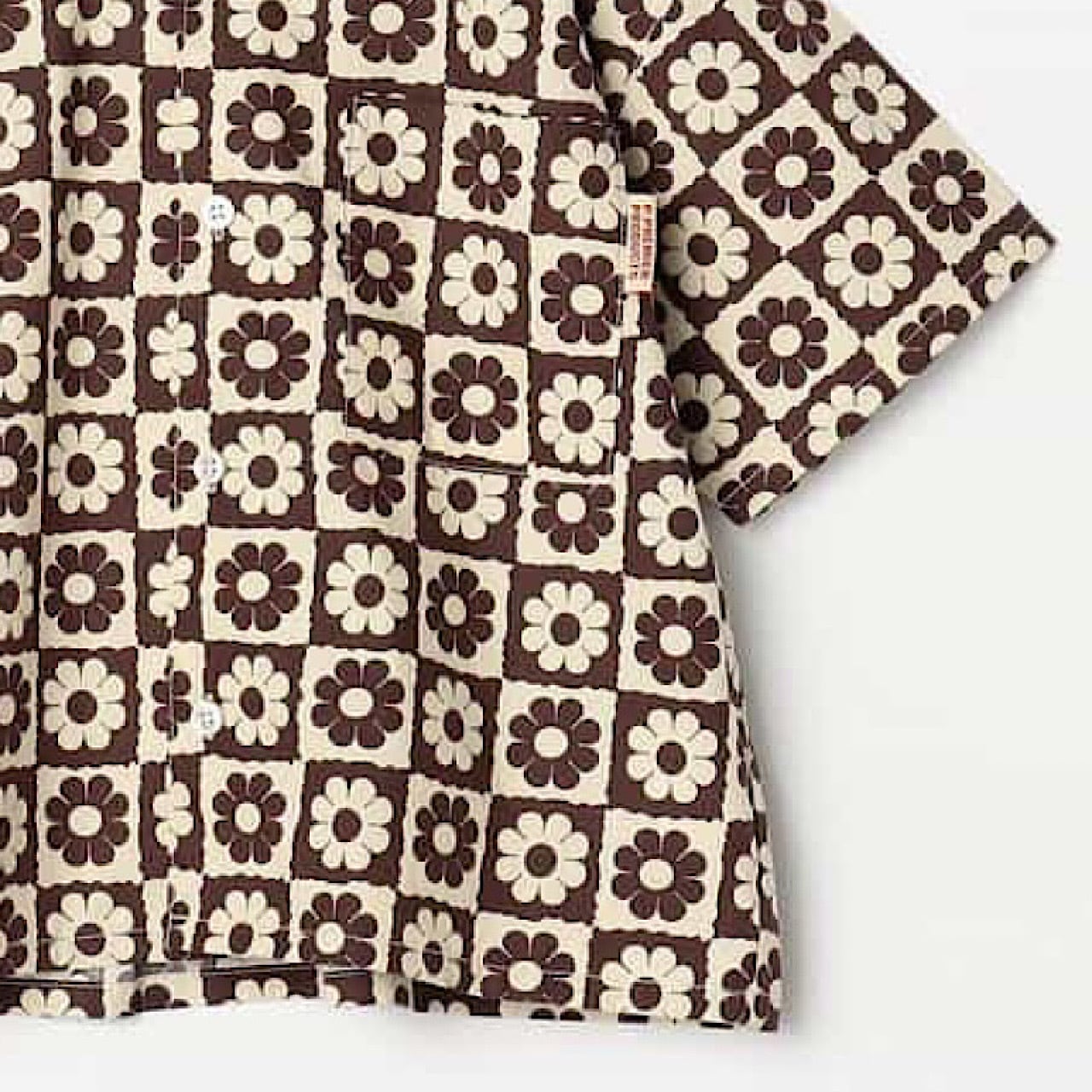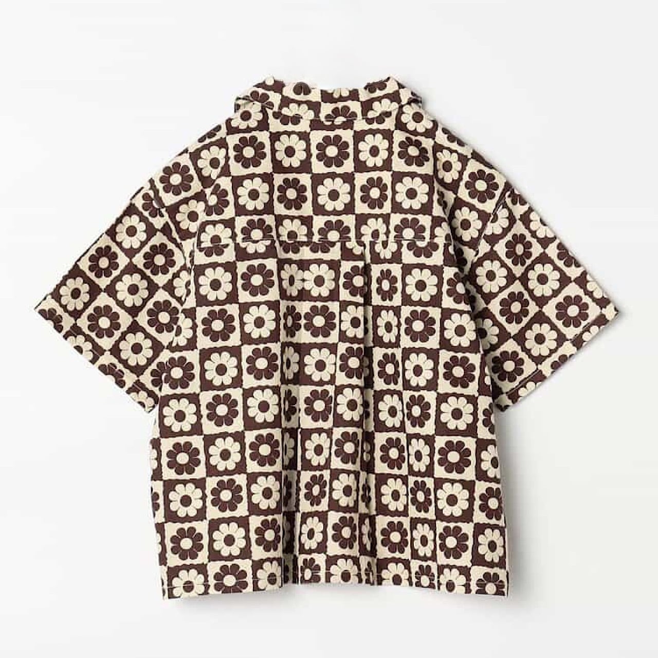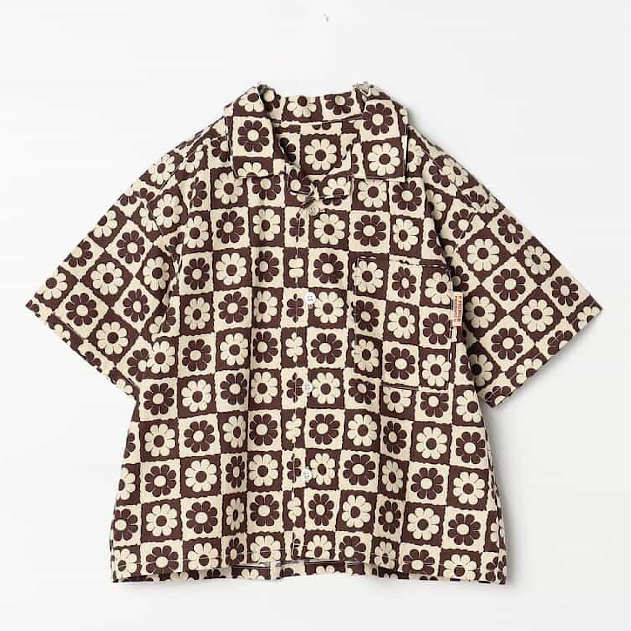 半袖の総柄シャツ。ゆったりしたシルエットで風通りが良く、真夏でも快適に過ごせます。